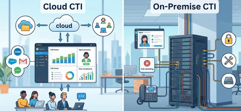 On premise CTI runs on hardware your organization owns on site, giving full control over call routing, data residency, and carrier choice. Cloud CTI is delivered by a provider over the internet, offering faster deployment and scalability with less control over the underlying infrastructure.